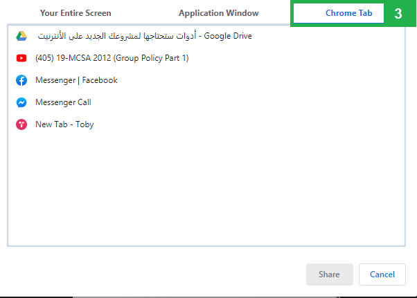 التبويبة الثانية تمكنك من مشاركة سطح شاشة لتطبيق محدد عوض مشاركة سطح شاشة المكتب بالكامل, فقط ما عليك سوى اختيار شاشة التطبيق المناسب الذي تود مشاركته